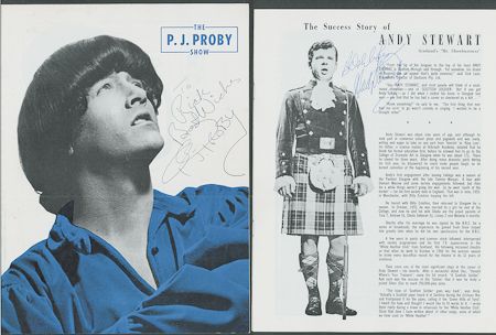 Though P.J. Proby's time in the spotlight was very brief, his charismatic stage presence made the Texas native a concert favorite during the mid-1960's. In black ballpoint pen, he has signed the front cover of this fall 1965 program "To Rick, Best Wishes, P.J. Proby," and, additionally, an EMI publicity card. Australia's own Easybeats were together for less than a year when they signed on to the P.J. Proby tour in August '65. Within months, they were Australia's most popular rock group, generating fan hysteria known as "EasyFever." They extended their success worldwide in 1967 with the classic, "Friday On My Mind." The program is signed above their photo by Harry Vanda, George Young, Stephen Wright and Dick Diamonde as follows: "Best Wishes Little Stevie, Harry Vanda, Best Wishes George Easybeats, Best Wishes Dick Diamonde". Also included here is a program for Andy Stewart, known as Scotland's "Mr. Showbusiness." Signed in blue ballpoint pen by Stewart and Scottish support acts Sally Logan, Ian Powrie, Max Kaye, and Joe Gordon. Both programs are EX.