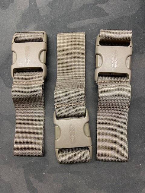 Set of three compression strap extenders. These will work on any Eberlestock pack with 38mm Dual Stealth buckles. Use them to get a little more reach around massive loads. For example, if you really jam-pack a J-type pack and have fully stuffed Super Spike Duffel mounted to the outside, you'll probably want these extension straps! Available in Dry Earth only, to match the trim on all of our newer hunting packs, and many of our tactical packs.