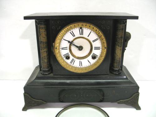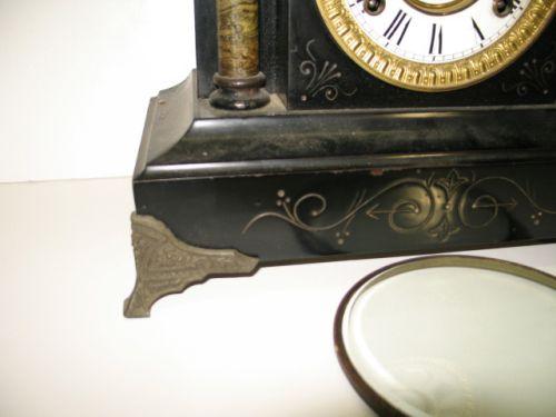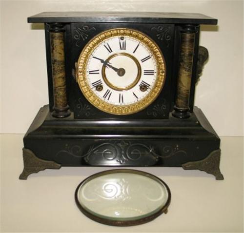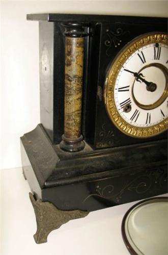 EBONIZED MANTEL CLOCK. Decorated with columns. Works made by Waterbury Clock Co., Waterbury, Conn. Rear door is missing. Glass door on front is detached. 10.25” H, 12.75” W