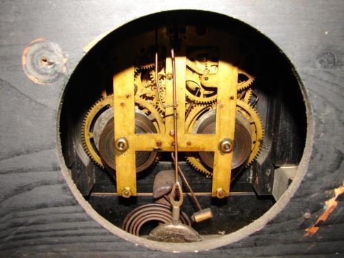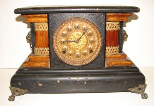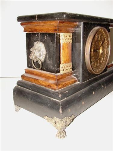 EBONIZED MANTEL CLOCK. Clock has lion head handles at sides and ornate brass feet. Brass clock face is unmarked and works are unmarked. Clock shows some scuffing and loss to ebonized paint at areas. 11” H, 17.5” L