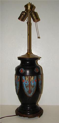 EBONIZED ORIENTAL STYLE TABLE LAMP. Lamp is decorated with Cloisonne style raised shield decorations around body with blue, white, and red painted decorations. Shows damage to wooden base. Electrified. 23.5” H
