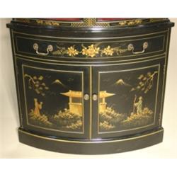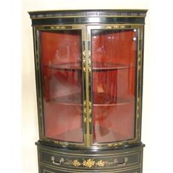Ebonized Orientalia half round corner cupboard. Has two glass doors on top, single drawer in middle, and two doors on bottom. 71" H, 35.5" W, 21" D.