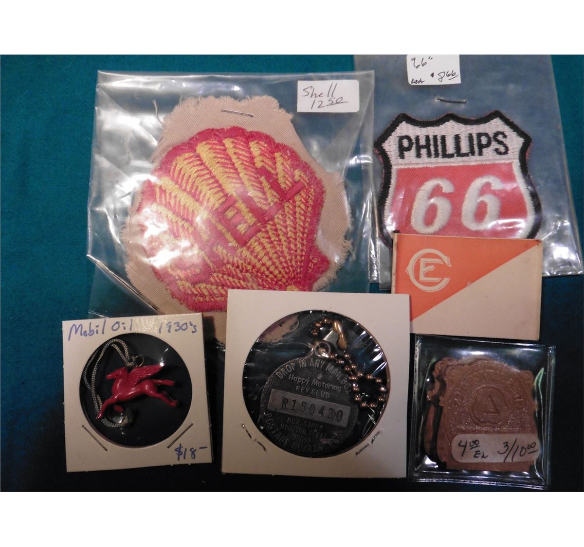 “EC” Flag on pin (I was told one time what the significance of this item was, but I just don't remember); 1930 era Mobil Oil Company winged horse; (8) “Cities Service Oils Once-Always” foil advertisements; “Phillips 66” Advertising cloth patch; “Shell” Advertising cloth patch; & a “Put a Tiger in Your Tank ESSO” Key chain.