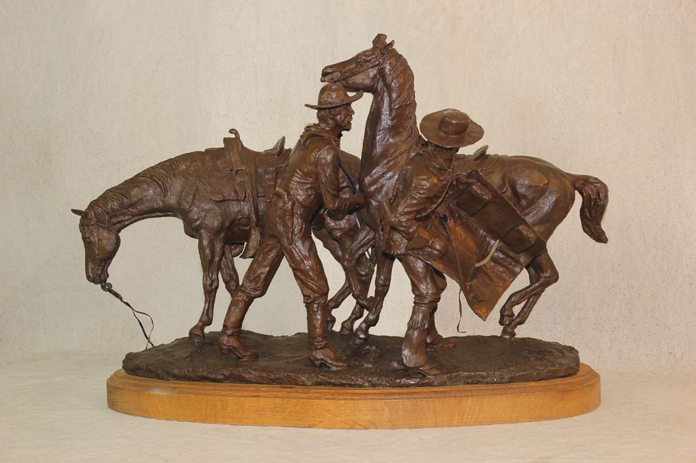 Large attractive bronze depicting two cowboys saddling horses. Signed in cast E.C. Heikka 31/35. Measurements 26"x 18"x 9".