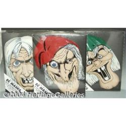 EC "Three GhouLunatics" Masks, Limited Hand-Painted Edition 9/25 (EC, 1972). Produced exclusively for the 1972 EC Fan-Addict Convention, these are extremely rare Halloween-style masks depicting ECs famous trio of horror hosts: the Old Witch, the Crypt Keeper, and the Vault Keeper. Sculpted and hand-painted by Bob Cabeen, these were produced in a limited run of 25 sets, of which this is #9. Similar masks were produced in larger numbers, but left unpainted -- these hand-painted versions are far scarcer and are treasured by EC collectors. Each mask is in mint condition and is still in its original box, which are all near-mint, exhibiting only the slightest of overall wear. 3 pieces Important notice: Heritage usually auctions material at the rate of 200-250 lots per hour. On some occasions eBay Live bid software or the Internet may not be able to keep up with the pace of the auction. We recommend placing a realistic absentee bid now as insurance to avoid disappointment. Occasionally the auctioneer may eliminate or reject an eBay Live bid, and the auctioneer may also reopen a lot after the close of the eBay live bidding (usually because we missed an audience bid), and may reject your bid even if it shows you as the winning bidder. By bidding via eBay Live, you agree that Heritage may award the lot to another bidder at its sole discretion under the circumstances described above or any other reasonable circumstances. Since eBay bids are not shown to us until we open the lot on the floor, we treat those bids just like floor bids. In most cases the floor responds before the eBay bid is presented to us, due to Internet lag time, so for consistency we have made it a policy that floor bids are always considered first over tie eBay live bids. Also please note that all Heritage lots purchased through eBay Live carry a 20% Buyer's Premium. Please make sure you read the Terms and Conditions before you bid.