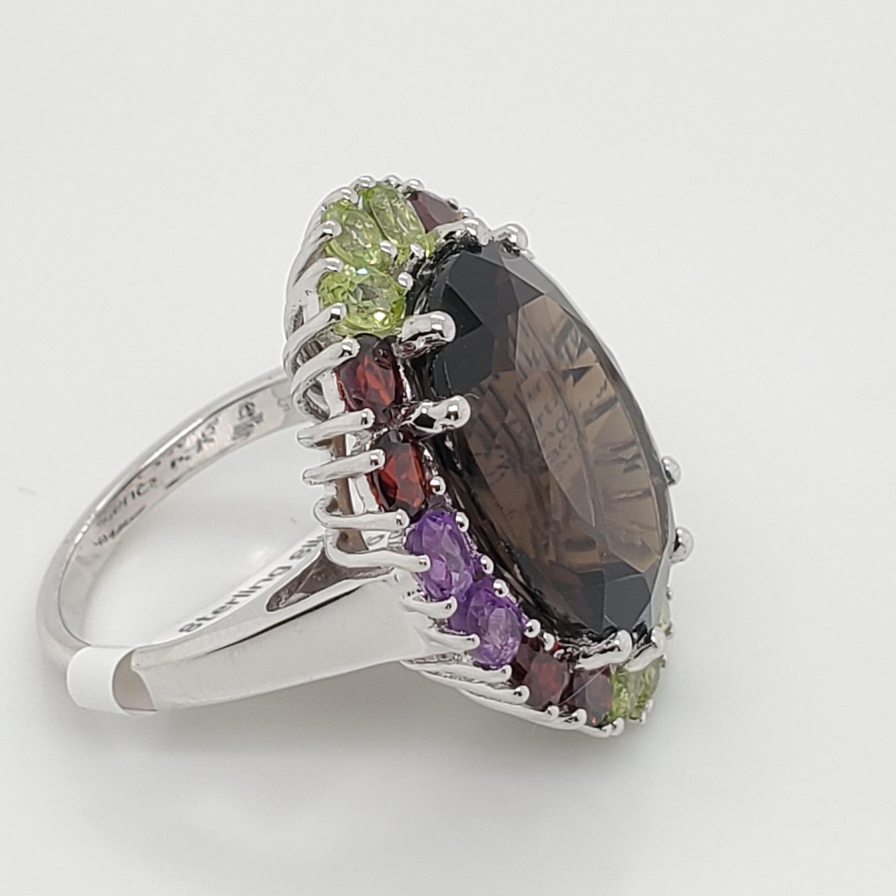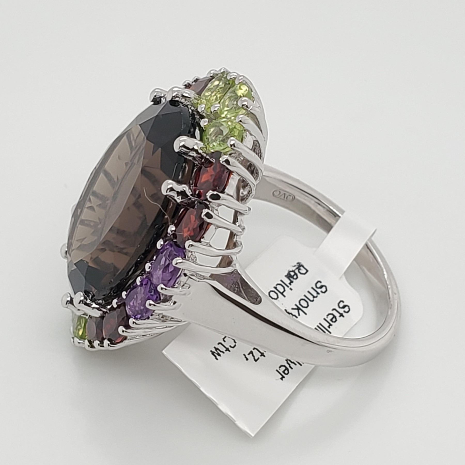 SILVER SMOKY QUARTZ,PERIDOT(16.3CT) RING (~SIZE 6.75)(RING IS RESIZABLE FOR $40) (~WEIGHT 10.8G), SUGGESTED RETAIL VALUE $600