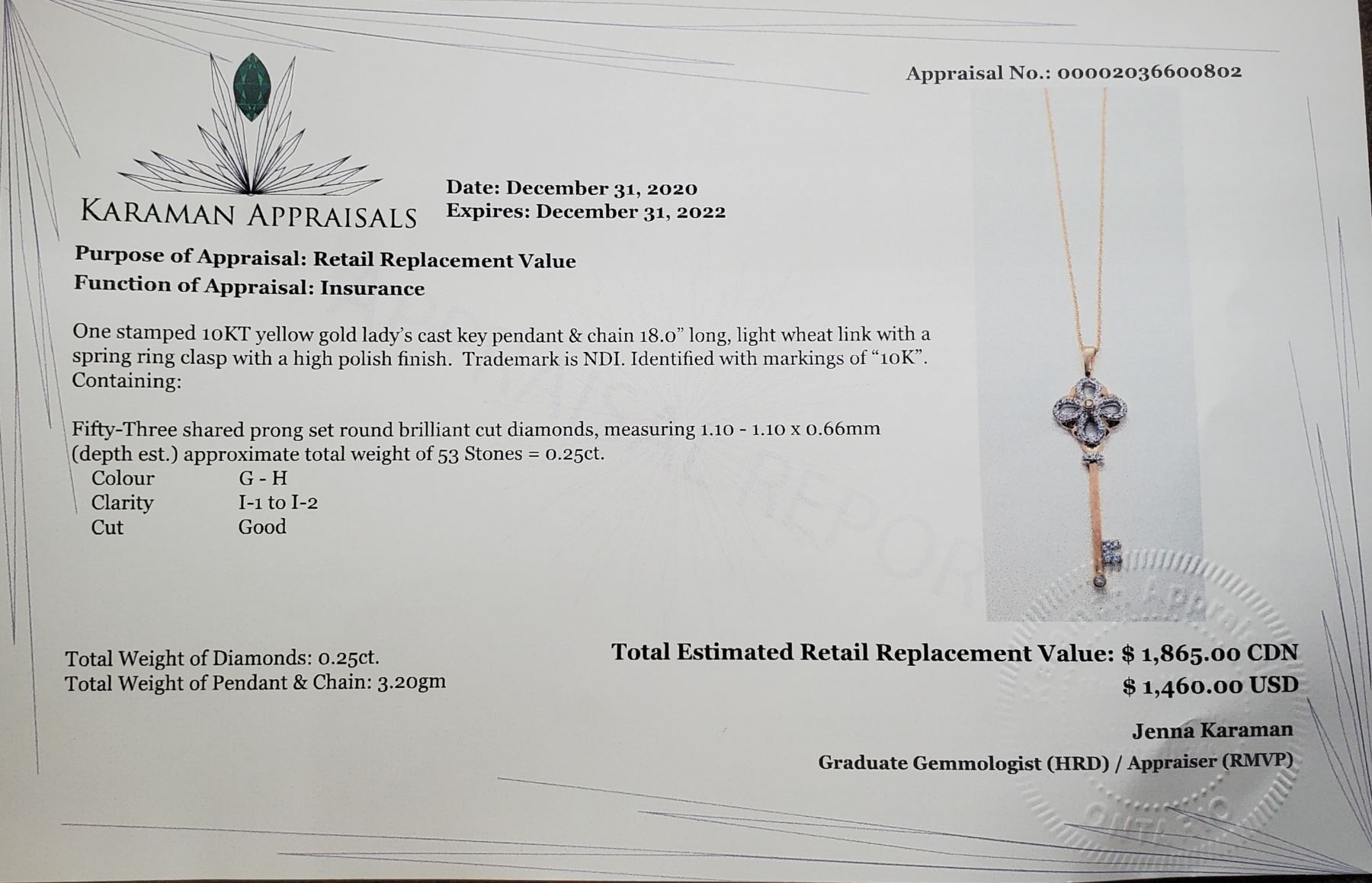 10K YELLOW GOLD DIAMOND(0.25CT) KEY PENDANT AND WHEAT LINK NECKLACE WITH SPRING RING CLASP, 53 PRONG SET DIAMONDS(G-H, I1-I2) NECKLACE WEIGHT 3.2G, APPRAISED RETAIL $1865 **ALL ITEMS MUST BE REMOVED BY 5PM SATURDAY, MAY 27TH 2023. ALL REMAINING ITEMS WILL BE SUBJECT TO A $6.00 PER DAY STORAGE CHARGE. ANY ITEMS REMAINING AFTER MONDAY, JUNE 12TH, 2023 WILL BE CONSIDERED FORFEITED. NO REFUNDS WILL BE ISSUED FOR FORFEITED ITEMS. TO SCHEDULE A PICK UP APPOINTMENT CLICK HERE