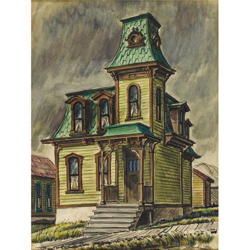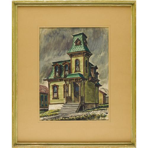 <B>ED BEARDEN (1919-1980)</B></I><BR><I>House in Leadville,</B></I> 1946<BR>Watercolor<BR>16in. x 12in.<BR>Signed and dated lower right<BR>Signed and titled verso<BR><BR>In 1944, Ed Bearden took a leave of absence from his position at the Dallas Museum of Fine Arts to study under Otis Dozier and Boardman Robinson, at the Colorado Springs Fine Arts Center. This watercolor was painted during that period.<BR><BR>Provenance:<BR>Collection of Bill and Mary Cheek<BR><BR> <B>Condition Report:</B> Excellent condition. Period frame in excellent condition.<BR><BR><b>Shipping:</b> Requires 3rd Party Shipping (<a target="_blank" href="http://www.heritageauctions.com/common/shipping.php">view shipping information</a>)