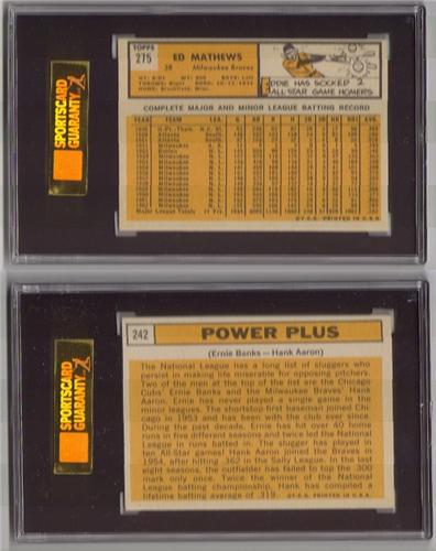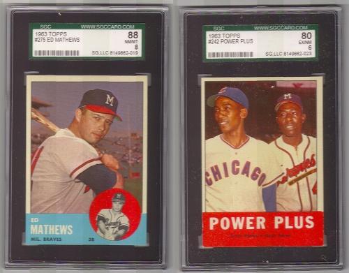 ED MATHEWS & HANK AARON BASEBALL CARDS. Consists of one Ed Mathews 1963 Topps baseball card. #275. Graded by SGC. 88. NM/MT 8. 8149862-019. Also consists of one Hank Aaron/Ernie Banks Power Plus 1963 Topps baseball card. #242. Graded by SGC. 80. EX/NM 6. 8149862-023.