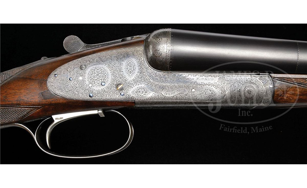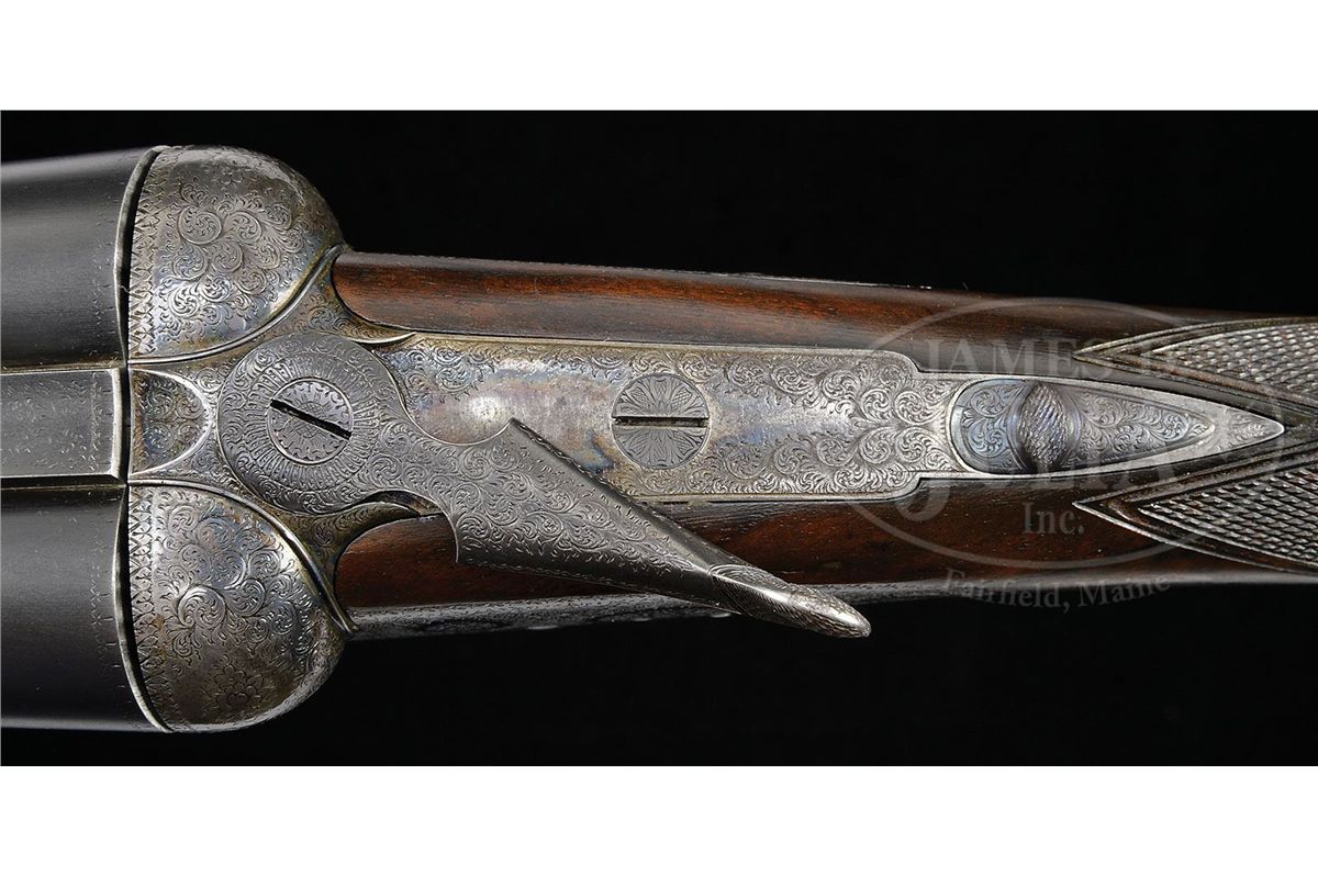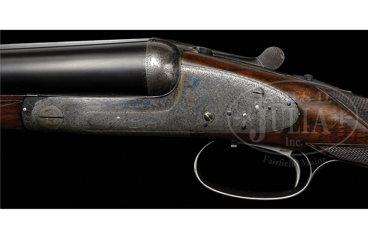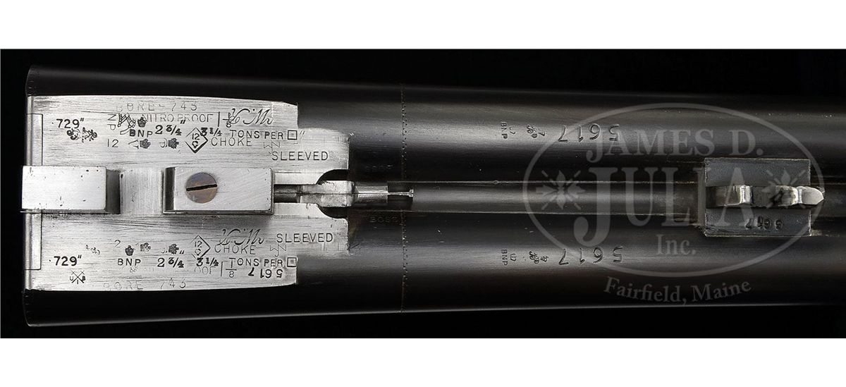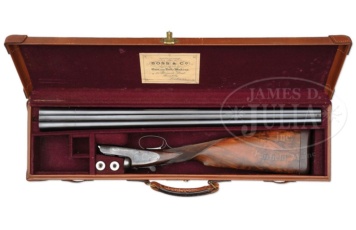 SN 5617. Cal. 12 ga. 2-3/4" Chambers. 26" Sleeved bbls with concave game rib, are stamped on flats with old London nitro proofs, and Birmingham nitro proofs for 2-3/4" chambers, also with "SLEEVED" and "W. R" (Westley Richards). Bottoms of new tubes are stamped with Birmingham proofs and SNs. Boss round bodied, case hardened action is stocked to the fences, and features non-automatic safety, gold band tumbler end cocking indicators, and Miller single selective trigger (intercepting sears removed). Action and lockplates are engraved in classic "best" Boss fashion, with 18 rose bouquets surrounded by well cut small scroll. "Boss Patent" is on both sides of action. Gun was built for a left hand shooter, with top lever pivoting to the left. Single beaded trigger guard has bead on left side. Beautifully marbled and flame figured European walnut straight grip buttstock is cast-on, and measures 13-3/4" over brown leather covered pad. Classic point pattern checkering with mullered borders is at grip, and a gold oval on toe line is engraved "E. Z". Matching splinter Boss ejector forend has Anson release. Bore diameter: left-.729, right -.728. Bore restrictions: left -.005 (Skeet), right -.007 (IC). Wall thickness: left -.035, right -.040. Drop at heel: 2-3/8", drop at comb: 1-9/16". Weight: 7 lbs. 0 oz. LOP: 13-3/4". Abercrombie & Fitch VC leather case with stitched leather corners, has oval leather overlaid medallion embossed "James E. Fender" on top. Interior is lined in burgundy cloth with paper Boss label on lid, and contains 2-pc walnut and brass cleaning rod, and a pair of A & F marked snap caps. PROVENANCE: From the collection of noted writer, J. E. Fender, who intends to write an article on this gun. Copies of correspondence between gun writer, Ed Zern, (Field and Stream - Exit Laughing, as well as many other articles and several books) and Abercrombie & Fitch, as well as Holland & Holland, regarding the interesting story of Zern's purchase of this gun from A & F in 1964, and having it re-sleeved by H & H in 1970. CONDITION: Excellent, as refurbished. Bbls retain nearly all of a satin re-blue. Action and lockplates retain most of their orig case hardening color, vivid where protected, and they have been lacquered. Stocks retain nearly all of a high quality oil finish, with a few subsequent minor marks and repairs, checkering correctly re-cut. Bores are excellent. Action is tight. Bbls are on face. Ejectors are in time. Trigger works. Case leather is darkening and has a considerable number of scuffs and marks. Handle is fine, with some loose stitching. Straps are good, one partially detached. Interior cloth is fine with some soil and compressions from contact with gun, as well as some mildew.ÊÊLabel is fine with some slight soiling. Accessories are fine. An unusual gun with an interesting history. 4-48899 MGM219
