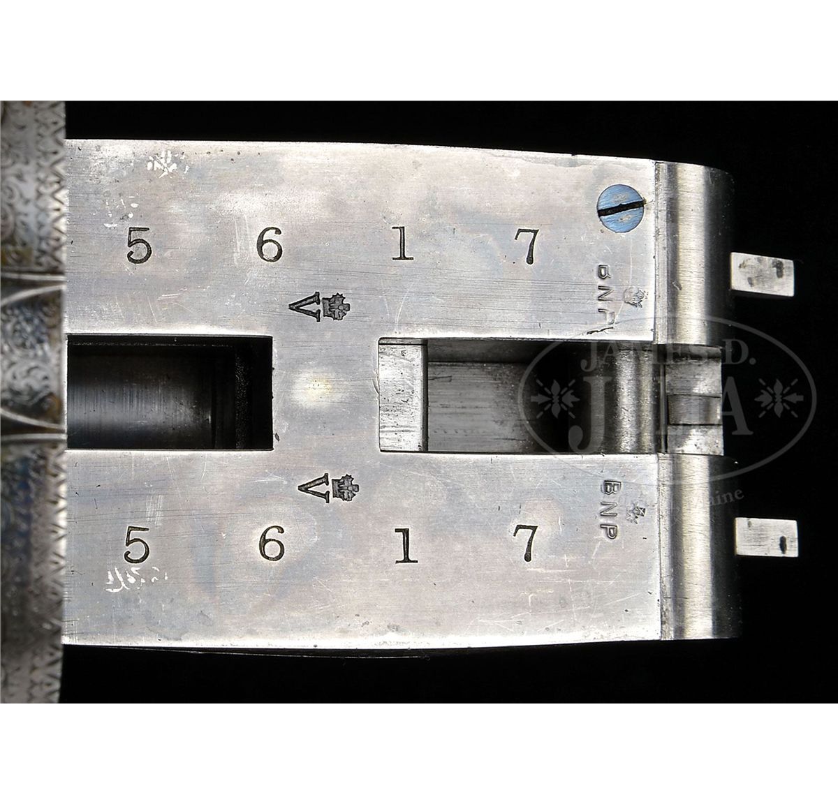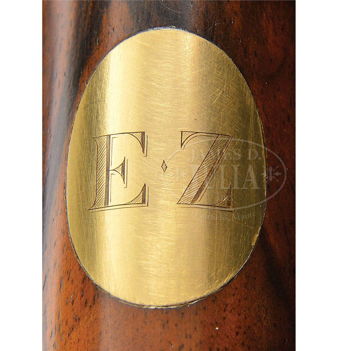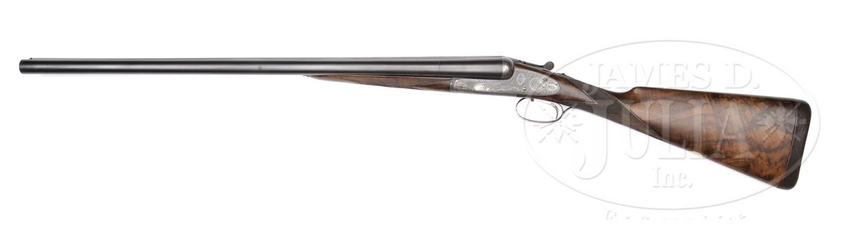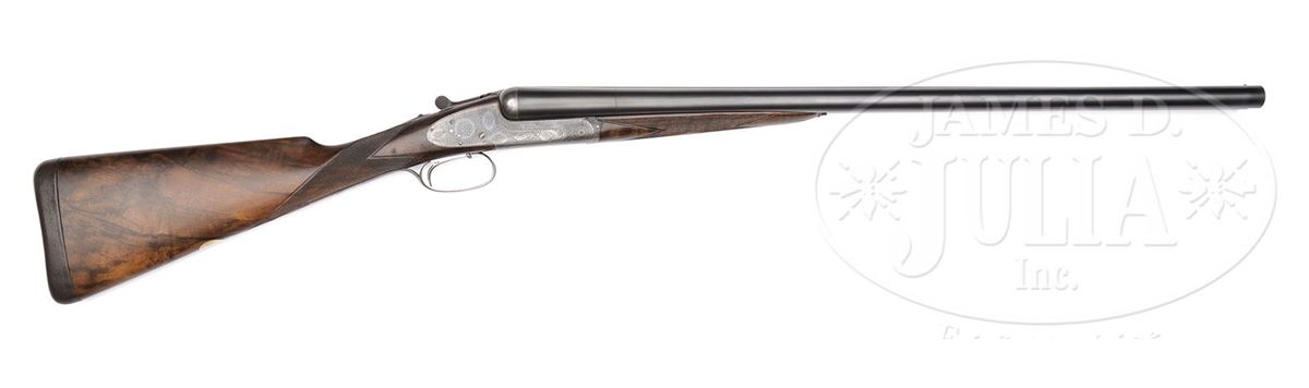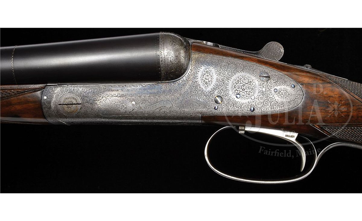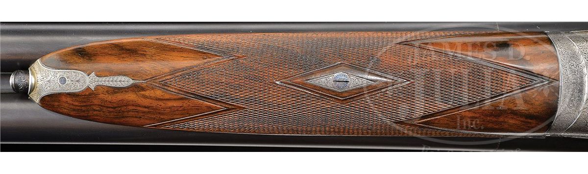 SN 5617. Cal. 12 ga. 2-3/4" Chambers. 26" Sleeved bbls with concave game rib, are stamped on flats with old London nitro proofs, and Birmingham nitro proofs for 2-3/4" chambers, also with "SLEEVED" and "W. R" (Westley Richards). Bottoms of new tubes are stamped with Birmingham proofs and SNs. Boss round bodied, case hardened action is stocked to the fences, and features non-automatic safety, gold band tumbler end cocking indicators, and Miller single selective trigger (intercepting sears removed). Action and lockplates are engraved in classic "best" Boss fashion, with 18 rose bouquets surrounded by well cut small scroll. "Boss Patent" is on both sides of action. Gun was built for a left hand shooter, with top lever pivoting to the left. Single beaded trigger guard has bead on left side. Beautifully marbled and flame figured European walnut straight grip buttstock is cast-on, and measures 13-3/4" over brown leather covered pad. Classic point pattern checkering with mullered borders is at grip, and a gold oval on toe line is engraved "E. Z". Matching splinter Boss ejector forend has Anson release. Bore diameter: left-.729, right -.728. Bore restrictions: left -.005 (Skeet), right -.007 (IC). Wall thickness: left -.035, right -.040. Drop at heel: 2-3/8", drop at comb: 1-9/16". Weight: 7 lbs. 0 oz. LOP: 13-3/4". Abercrombie & Fitch VC leather case with stitched leather corners, has oval leather overlaid medallion embossed "James E. Fender" on top. Interior is lined in burgundy cloth with paper Boss label on lid, and contains 2-pc walnut and brass cleaning rod, and a pair of A & F marked snap caps. PROVENANCE: From the collection of noted writer, J. E. Fender, who intends to write an article on this gun. Copies of correspondence between gun writer, Ed Zern, (Field and Stream - Exit Laughing, as well as many other articles and several books) and Abercrombie & Fitch, as well as Holland & Holland, regarding the interesting story of Zern's purchase of this gun from A & F in 1964, and having it re-sleeved by H & H in 1970. CONDITION: Excellent, as refurbished. Bbls retain nearly all of a satin re-blue. Action and lockplates retain most of their orig case hardening color, vivid where protected, and they have been lacquered. Stocks retain nearly all of a high quality oil finish, with a few subsequent minor marks and repairs, checkering correctly re-cut. Bores are excellent. Action is tight. Bbls are on face. Ejectors are in time. Trigger works. Case leather is darkening and has a considerable number of scuffs and marks. Handle is fine, with some loose stitching. Straps are good, one partially detached. Interior cloth is fine with some soil and compressions from contact with gun, as well as some mildew.ÊÊLabel is fine with some slight soiling. Accessories are fine. An unusual gun with an interesting history. 4-48899 MGM219