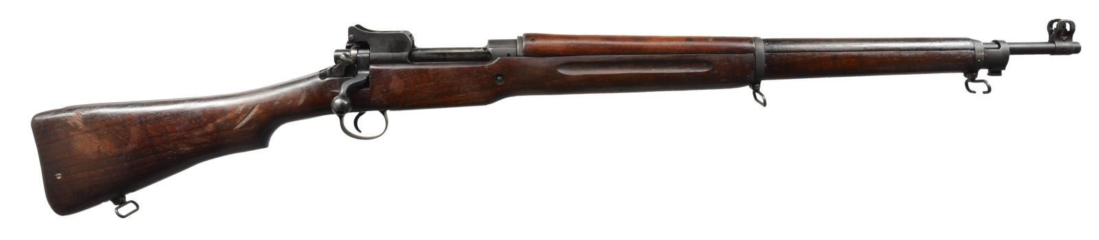 Cal. 30-06. S# 370041. Bbl. 26", marked behind front sight w/ “E”, flaming bomb & “2-18”. Bolt marked “R”. Safety marked “E”. Ladder aperture rear sight graduated to 1600yds. Blade front sight w/ protective ears. Walnut stock set. Stock marked at tip of forend w/ “7”. Marked on left side over trigger guard w/ “RA-P” indicating arsenal overhaul. Plastic oiler in butt. CONDITION: stock set has 70% original finish w/ wear, scratches & 2 gouges on right side of butt along w/ moderate area of removed finish. Metal retains 70% thinning original finish w/ thinning, wear & scattered scratches. Bore has strong rifling, but turning dark in grooves. (20-1806/RW). CURIO. $300-500.