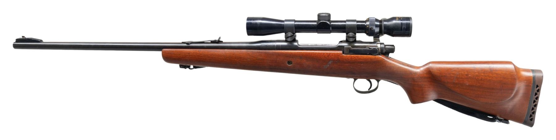Cal. 30-06. S# 5248. Bbl. 22". Well made sporting conversion of a U.S. Model 1917 military rifle. The barrel has been shortened to 22 1/4" and has an open sporting rear sight and a ramp front sight with a bead. A walnut sporter stock with a monte carlo comb and recoil pad replaces the military stock. The magazine is now blind utilizing the original trigger guard bow giving the rifle a nicely portioned look. Bolt is polished bright. The rifle has a Tasco 3-9X32 Omni- View scope in Weaver rings and bases. Duplex reticle. Rifle has QD swivels and black nylon strap. CONDITION: stock has light wear with scattered scratches and handling marks. Metal has most of its professional reblue with light wear. Good shiny bore with lightly worn lands. (24-4817/RW). MODERN. $200-400.