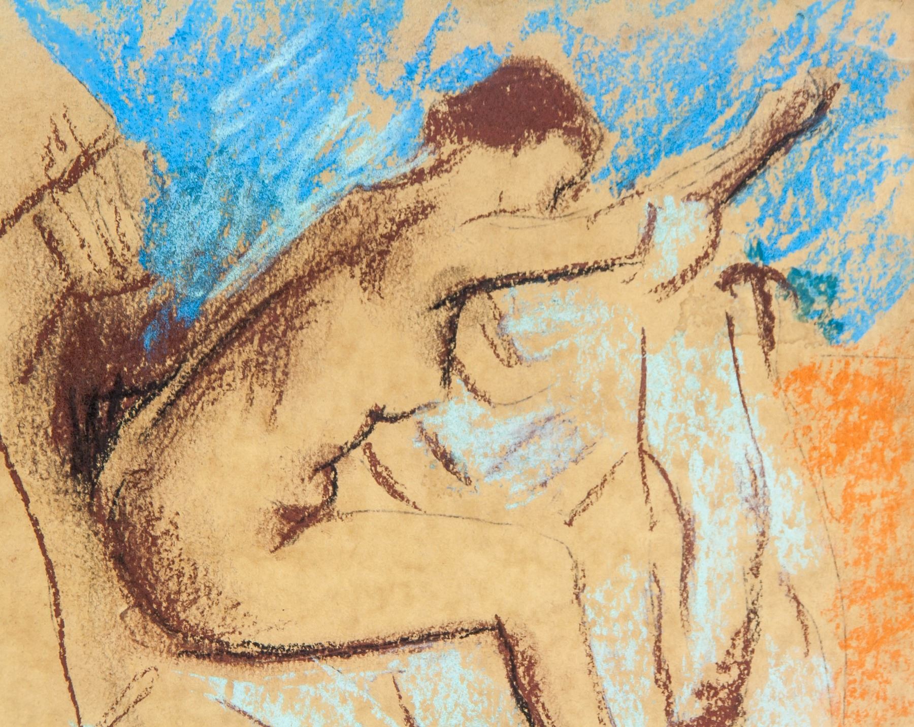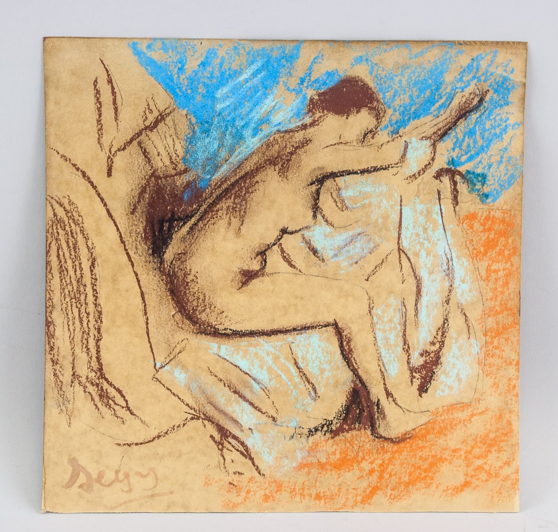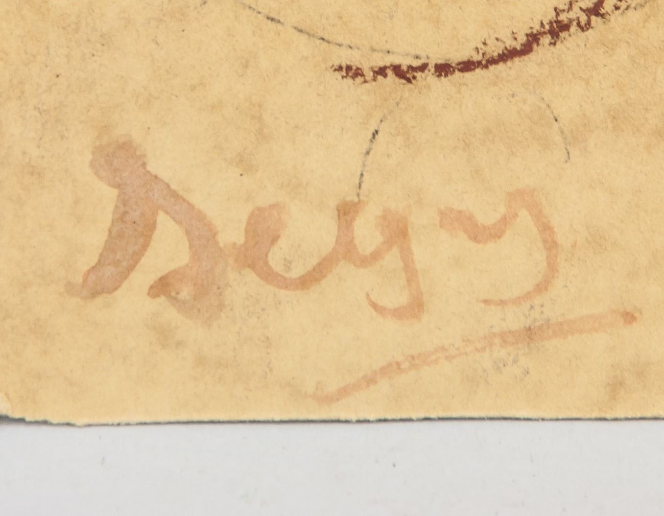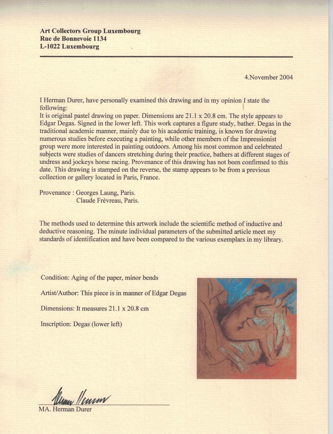 Pastel on paper. Featuring portrait of female nude. Signed and attr. Edgar Degas (French 1834-1917). Signature on lower left bottom. Stamped on verso. Accompanied with certificate of authenticity. 8.3 x 8.2 inch (21.1 x 20.8 cm). Always remembered as an Impressionist, Edgar Degas was a member of the seminal group of Paris artists who began to exhibit together in the 1870s. He shared many of their novel techniques, was intrigued by the challenge of capturing effects of light and attracted to scenes of urban leisure. But Degas's academic training, and his own personal predilection toward Realism, set him apart from his peers, and he rejected the label "Impressionist" preferring to describe himself as an "Independent."