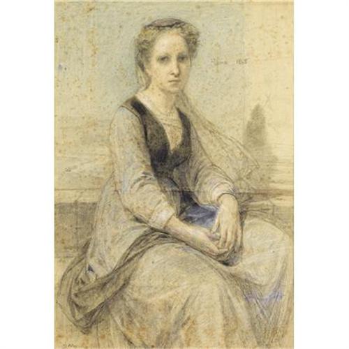 <B>Diogne Ulysse Napolon Maillart (French, 1840-1926)</B></I><BR><I>Roman Woman</B></I>, 1865<BR>Charcoal, blue and white chalk, and pencil on paper<BR>20 x 14-1/4 inches (50.8 x 36.2 cm)<BR>Initialed lower left: DM <BR>Inscribed near upper right: ROMA 1865<BR> <BR>This portrait study bearing the initials DM and the dated inscription "Roma 1865" may be attributed to Diogne Ulysse Napolon Maillart (French, 1840-1926), whose classicizing style accords with the features of the young girl depicted in this work. Maillart painted idyllic pastoral scenes and mythologies akin to those of Bouguereau and trained some of the most prominent Nabi artists including Vuillard. Finished compositional studies on paper similar to the present work are extremely rare.<BR><BR>In 1864, Maillart won the coveted Prix de Rome, an award which enabled him to study in Italy during 1865, the date of the present drawing. <BR>