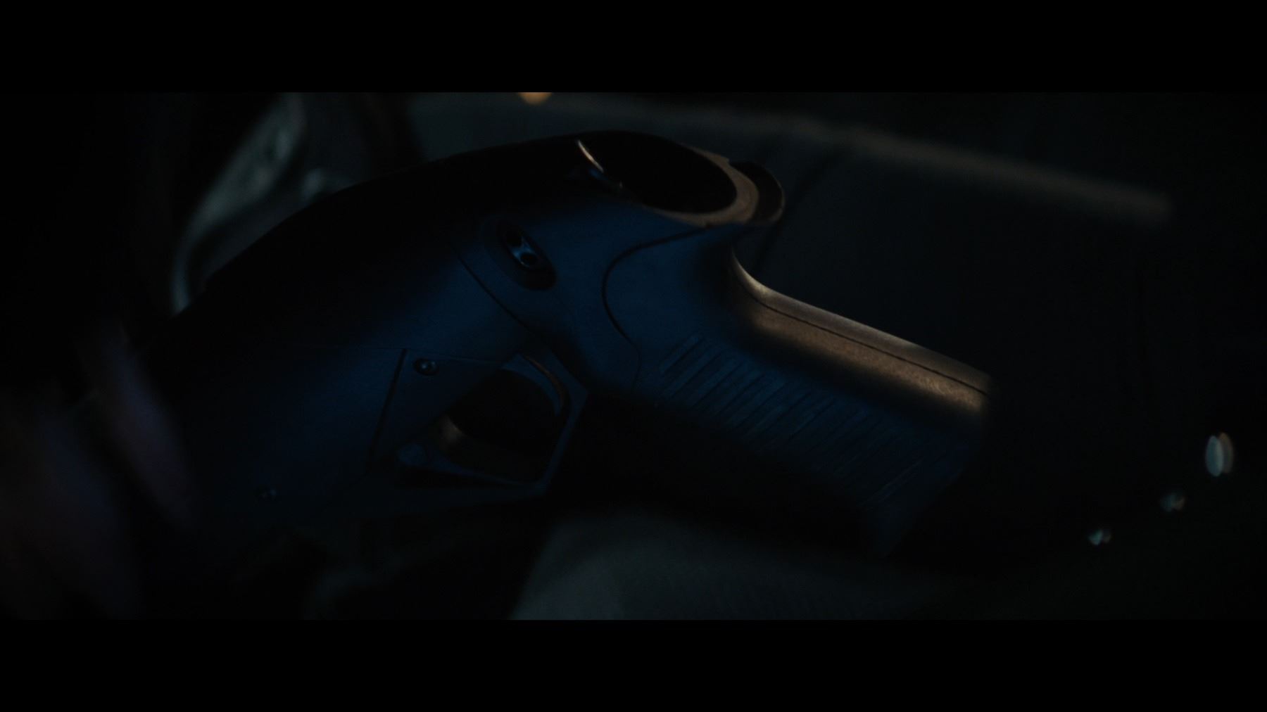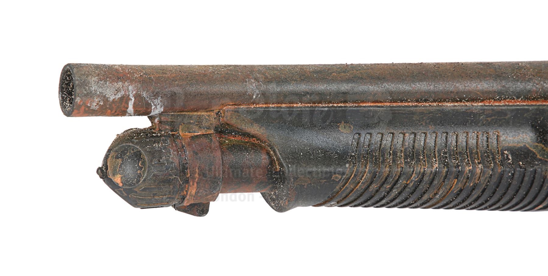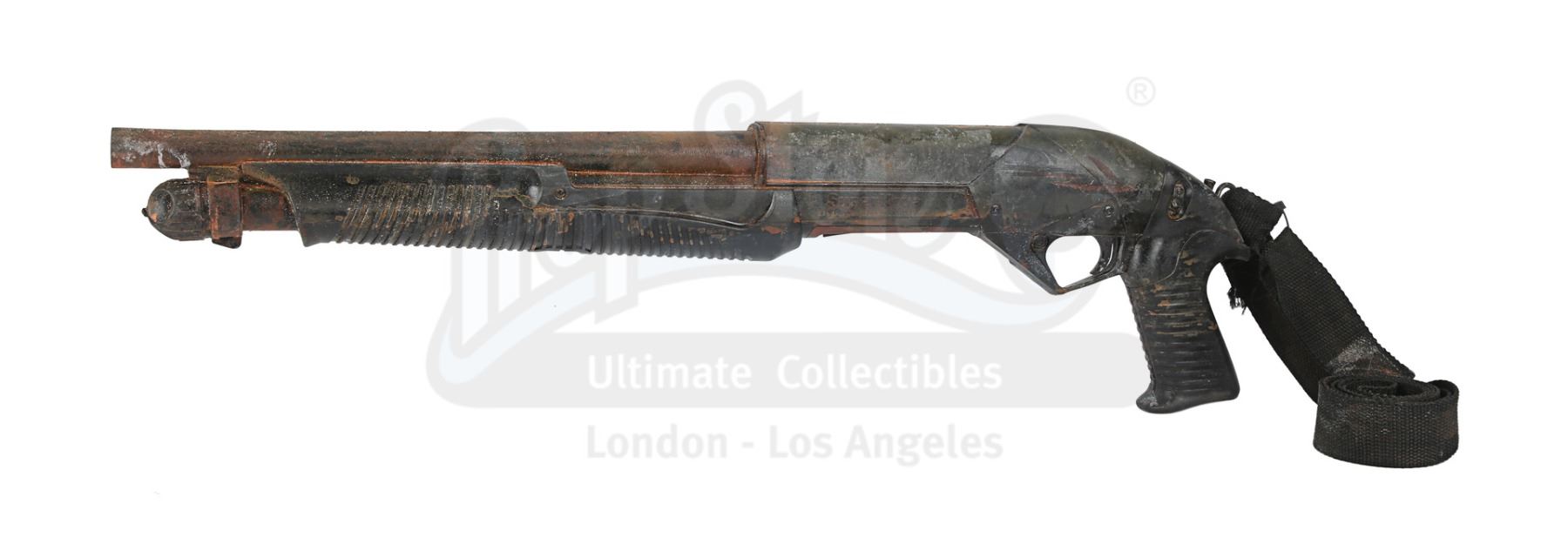 The shotgun is cast from a Benelli Supernova and is made of hardened rubber and a metal armature. It features a black strap at the back end so it can be slung over the shoulder. The shotgun has some rusty discolouration, staining and water damage distressing from production, as the Louvre set was very dirty and wet, with Cage running through water while carrying the weapon. Dimensions: 65 cm x 5 cm x 19 cm (25 1/2" x 2" x 7 1/2")