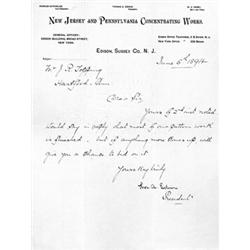 (1847 - 1931) American inventor of the electric light, phonograph, typewriter, and microphone, to name a few. Considered perhaps the greatest inventor of the century. Manuscript L.S. 1p. 4to., on New Jersey and Pennsylvania Concentrating Works, Edison, Sussex, Co., N.J., June 5, 1894, to J. R. Topping of Hartford Conn. informing him that "...most of our pattern work is finished - but if anything more comes up, will give you a chance to bid on it...". Usual folds, one only marginally affecting the "A" in Edison's signature, otherwise very good condition.