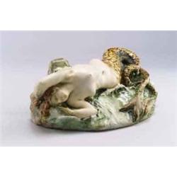 EDMOND LACHENAL, Châtillon-sous-Bagneux Luca Madrassi Figur Nixe, Keramik. Heller Scherben mit beigefarbener matter und mehrtonig grün-brauner glänzender Überlaufglasur. Auf gewölbtem naturalistischem Sockel liegende Nixe mit zur Seite gewundenem Oberkörper und Fischschwanz. Ellbogen rest. L.: 21 cm. Auf dem Sockel sign., bez. und dat.: L. MADRASSI., rückseitig ORIGINAL (geritzt) sowie E. LACHENAL Céramiste 1913 (schwarz gemalt). Unikat. 1913 Lit.: Erlesenes aus Jugendstil und Art Decó, Ausstell.Kat. des Grassimuseums Leipzig, Die Sammlung Giorio Silzer, Leipzig 1997, Abb. S. 161 (zu Madrassi)