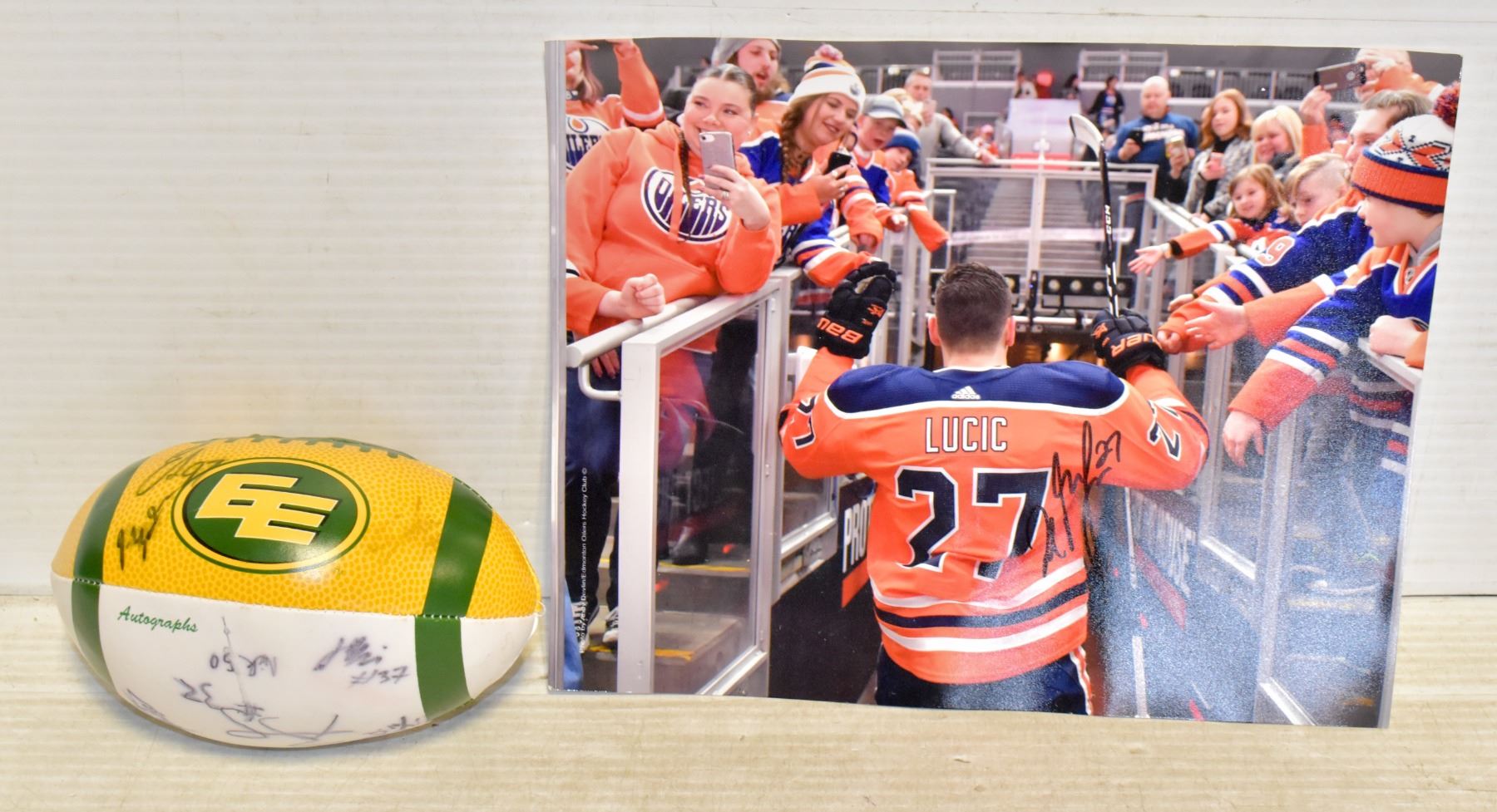 AUTOGRAPHED EDMONTON ESKIMOS MINI FOOTBALL AND OILERS LUCIC POSTER (8 X 11)