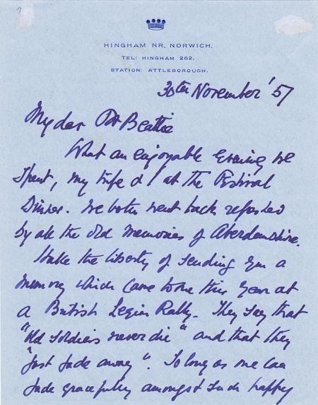 (1882 - 1971) British Field Marshal, Chief of the Imperial General Staff upon the outbreak of war, 1939. A.L.S. 2pp. 8vo., Norwich, Nov. 30, 1957. In part: "...they say that 'old soldiers never die' and that they 'just fade away'. So long as one can fade gracefully amongst the happy memories as I have...I feel that one has not lived in vain...". Very good.