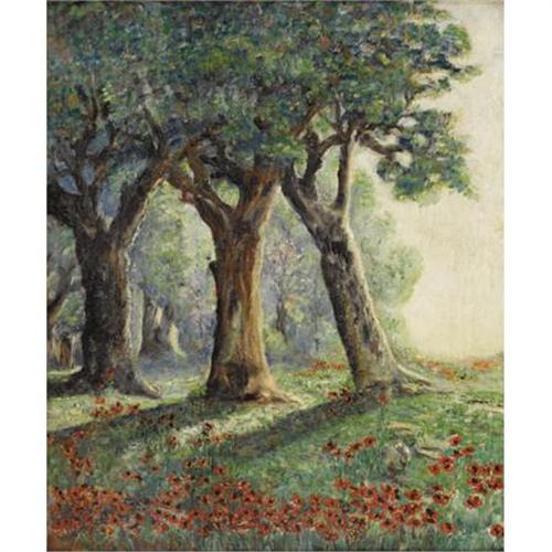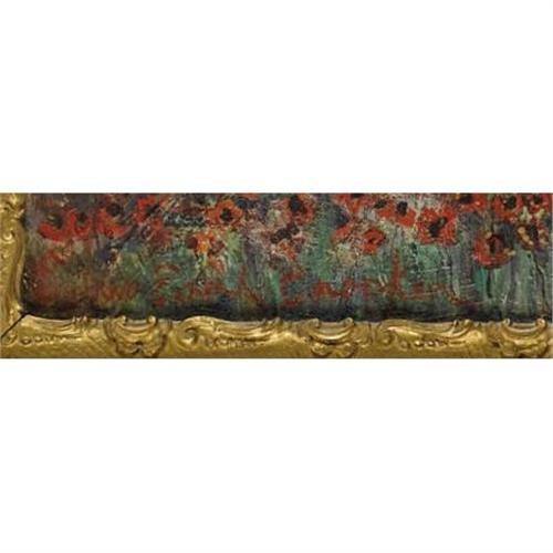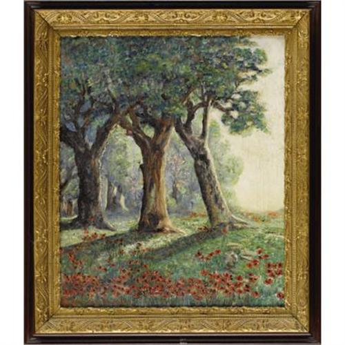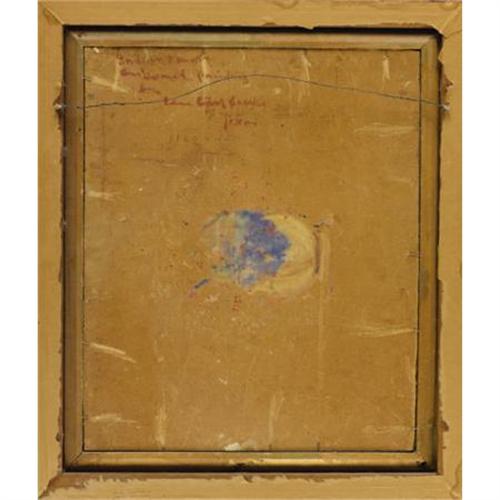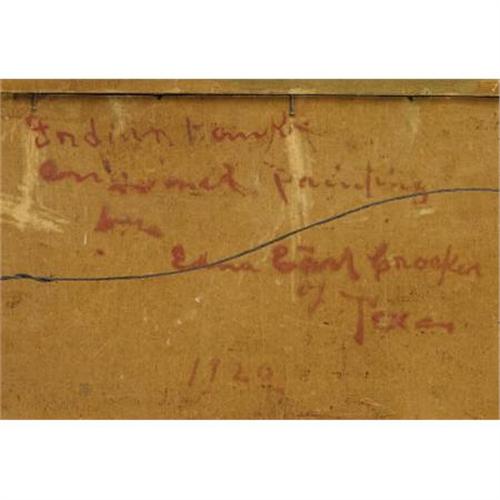 <B>EDNA EARL CROCKER (1877-1942)<BR></B></I><I>Indian Blanket</B></I>, 1926<BR>Oil on board<BR>23-1/2 x 19-1/4 inches (59.7 x 48.9 cm)<BR>Signed lower left<BR>Signed, dated, and titled verso<BR><BR> The Indian Blanket Flower usually appears in the late spring and signals the beginning of summer in most parts of Texas. With their showy bands of red and yellow blazing across wide swaths of land, they do indeed resemble colorful Indian blankets.<BR><BR>Legend has it that the flower was once all yellow and was a favorite of the Aztecs. Young Aztec women would decorate their hair with crowns of the golden flowers. When Cortez came and the land was drenched with the blood of the trusting inhabitants, the much loved flower, in pity, caught the blood of the innocents as they fell.....and to this day the red stains remain on the flower.<BR><BR>Provenance:<BR>Acquired by descent from the artist by the present owner<BR><BR><BR><B>Condition Report:</B> Excellent condition. Period frame in excellent condition.<BR><BR><b>Shipping:</b> Requires 3rd Party Shipping (<a target="_blank" href="http://www.heritageauctions.com/common/shipping.php">view shipping information</a>)
