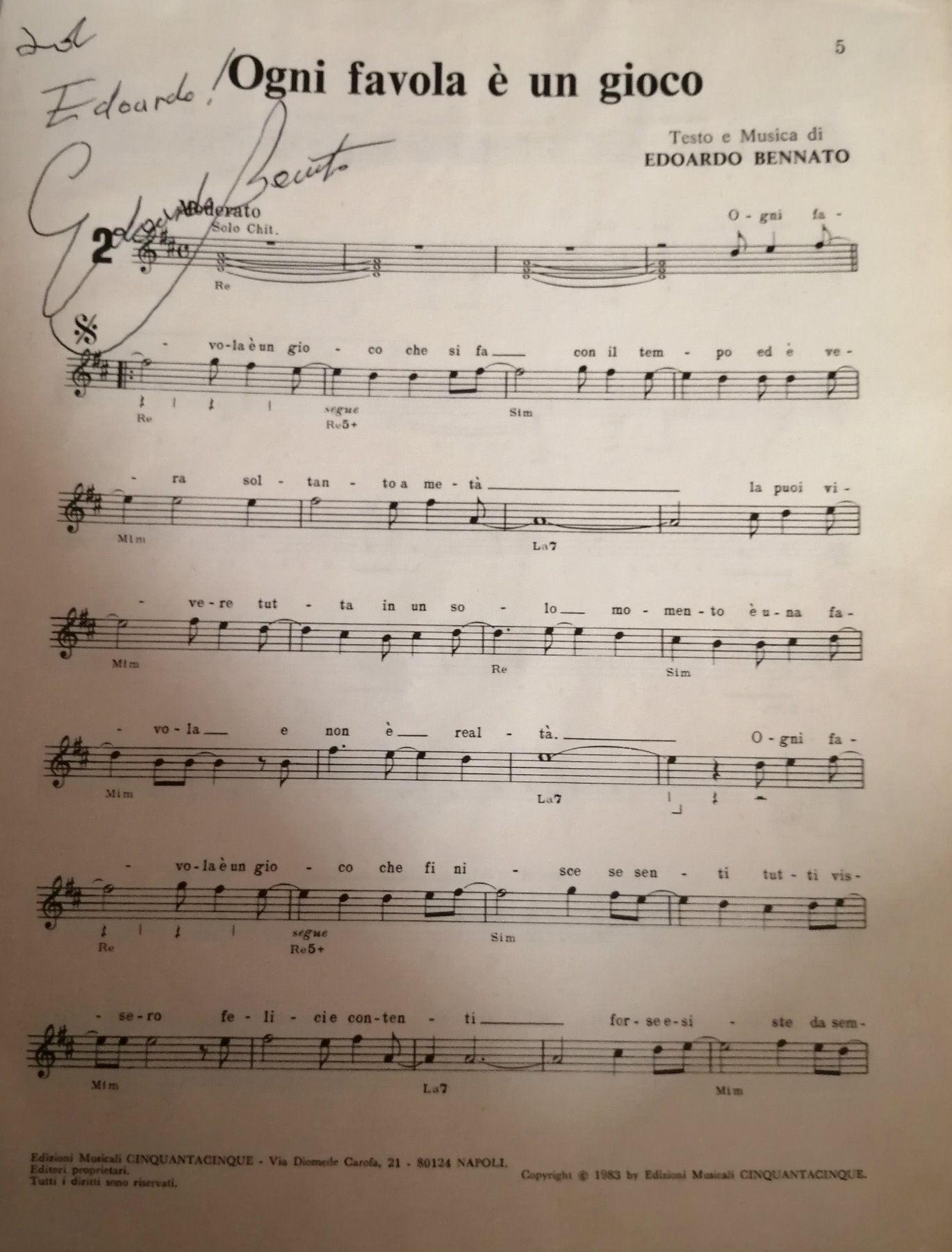 Edorado Bennato signed song sheet. Edoardo Bennato began his music career in the early Sixties (the first single was published on 1966) as one of the most creative and innovative songwriters of his time. His music distinguished itself for being an imaginative blend of blues, rock and roll, folk influences and even hints of opera.
