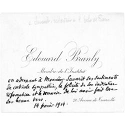 EDOUARD BRANLY: (1844 - 1940) French physicist whose invention of the coherer made wireless telegraphy possible. A.N. unsigned on his visiting card, 1p. 12mo., [n.p.], Feb. 14, 1914, in French to M. Savarit, sending his cordial greetings and his "happiness at his... initiative and thanking him for having read his beautiful verse". Boldly written at bottom margin and fine. $75-100