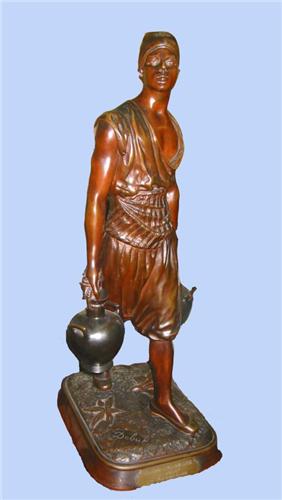 EDOUARD DROU0T (1859-1945) French school. "The Arab waterboy." A well cast brown patinated bronze figure. Signed on naturalistic base. Approx. 21" high. Attached with plaque inscribed for "1st Prize of Rome." Ref. Abage Encyclopedia of Bronzes, Vol. 3.