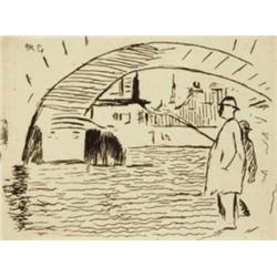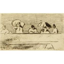 Cros, Charles; Le Fleuve. Gedicht mit 8 Orig.-Radierungen mit leichtem Plattenton (Titel- und Textvignetten). Paris, Librairie de l’Eau-Forte, (1874). 4<SUP>o</SUP>. Goldgepr. Lwdbd. in priv. silbergepr. Holzkassette. 15 SS. G. 63, a-h. M.-N. 23-30. H. 79. Skira 219. The Artist and the Book 177. - “Exemplaire d’épreuves” vor der Gesamtauflage von 100 Expl. auf “Holland”-Bütten. Im Impressum bezeichnet. 2 Radierungen mit dem Monogramm in der Platte. Auf chamoisfarbenem Vélin. Breite Ränder gering gebräunt bzw. angestaubt und teils mit winzigen Läsuren. Einband mit geringen Gebrauchsspuren. “Probably the first 19th century book to have a truly modern appearance, with etchings simplified almost to abstraction, a square format, and wide margins. Much of the atmospheric quality is due to careful printing by Auguste Delâtre,...who sometimes rubbed his plates slightly after wiping, to spread the ink and soften the tone” (The Artist and the Book, S. 124). Das hier vorliegende Exemplar ist vermutlich ein Probeexemplar für die Papierqualität.