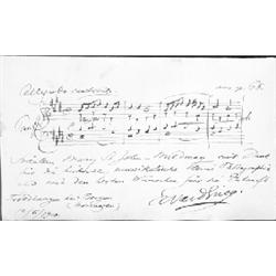 <b>462. EDVARD GRIEG</b> (1843 - 1907)<b> </b>Norwegian composer considered the founder of the Norwegian school of composition, composed music for Peer Gynt and Sigurd Jorsalfar. Fine and scarce A.M.Q.S. 1p. oblong 8vo., his home "<i>Troldhaugen</i>", Bergen (Norway), Dec. 5, 1900, a four double-measure quotation from Op. 68<b> </b>(Lyric Pieces IX), with the instructions "<i>Allegretto Cantabile</i>" at top. Beneath the quote, Grieg has penned a lengthy inscription to Mary St. John-Mildmay on the occasion of her "<i>musiklische</i>". Handsomely set, with a portrait, in brown matting with marbleized accents, and framed in a dark wood frame. A few small foxed spots at top, not affecting autograph, else very good condition, unexamined out of frame.<b>$2,000-3,000</b>
