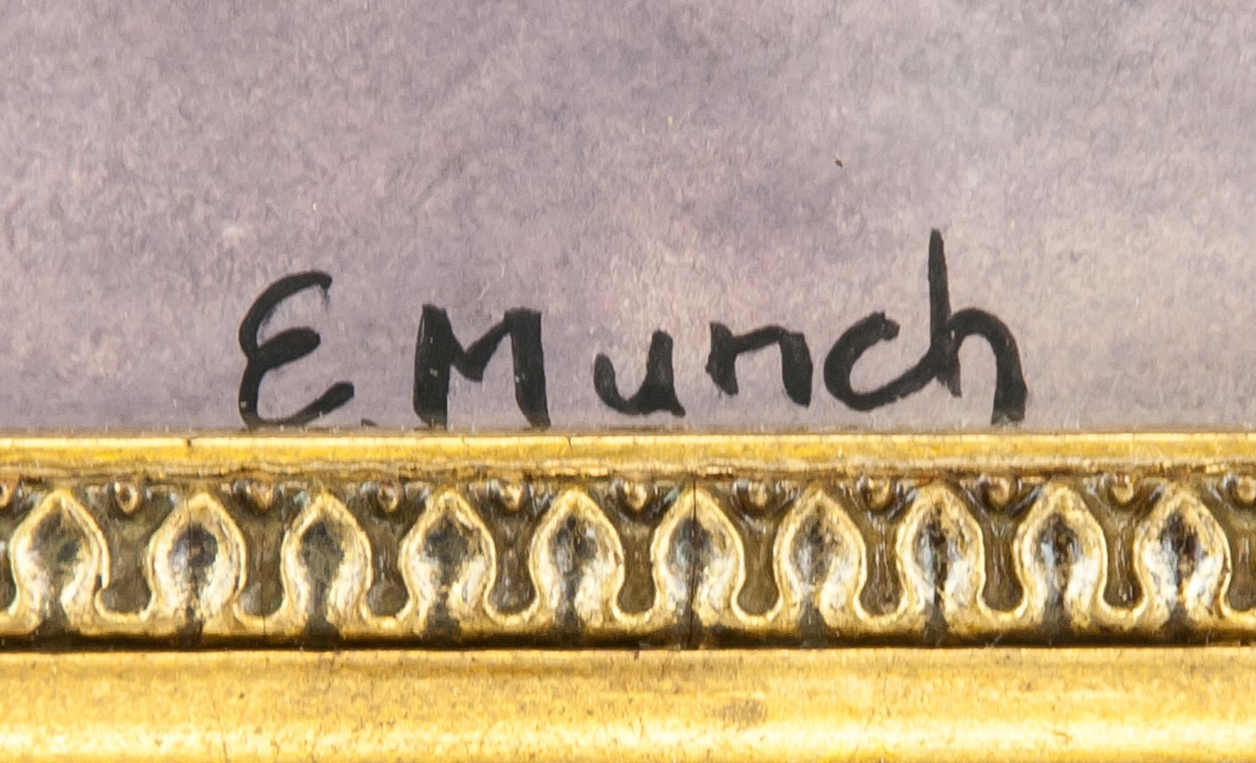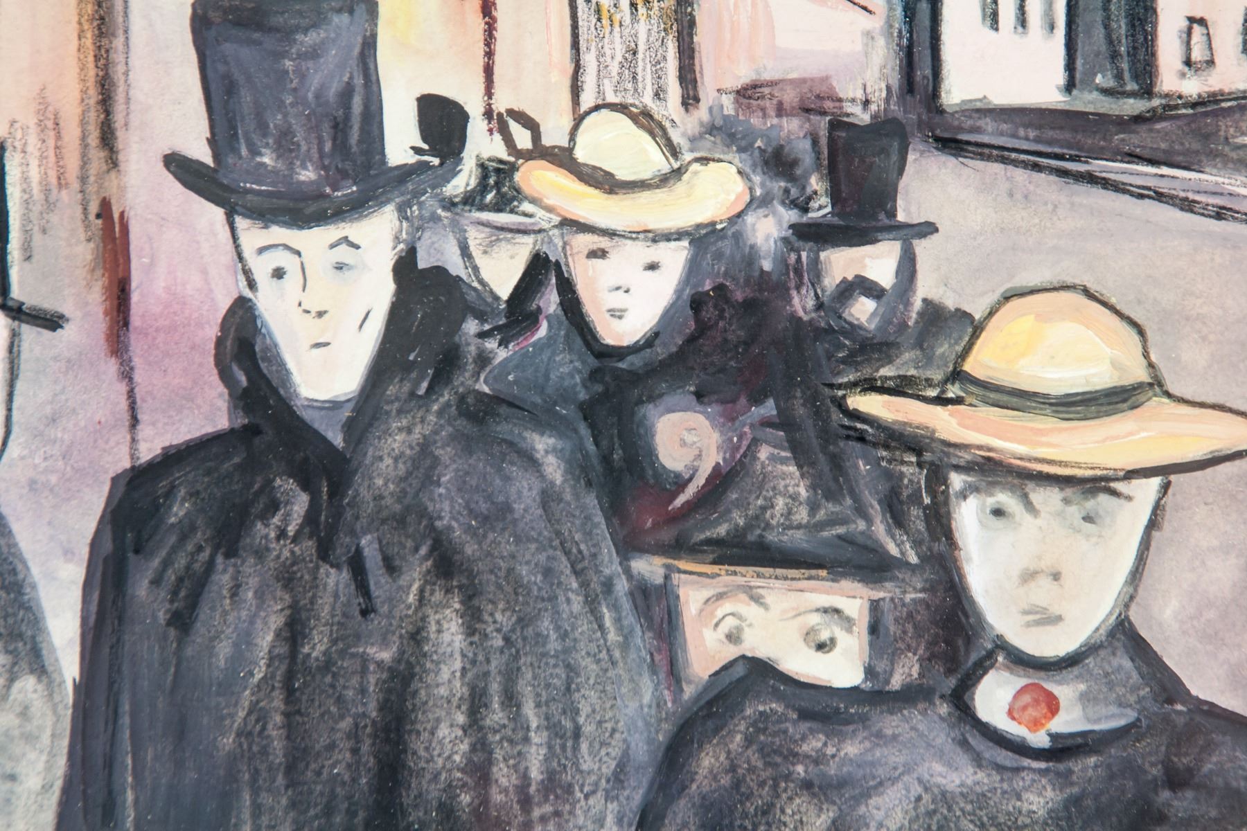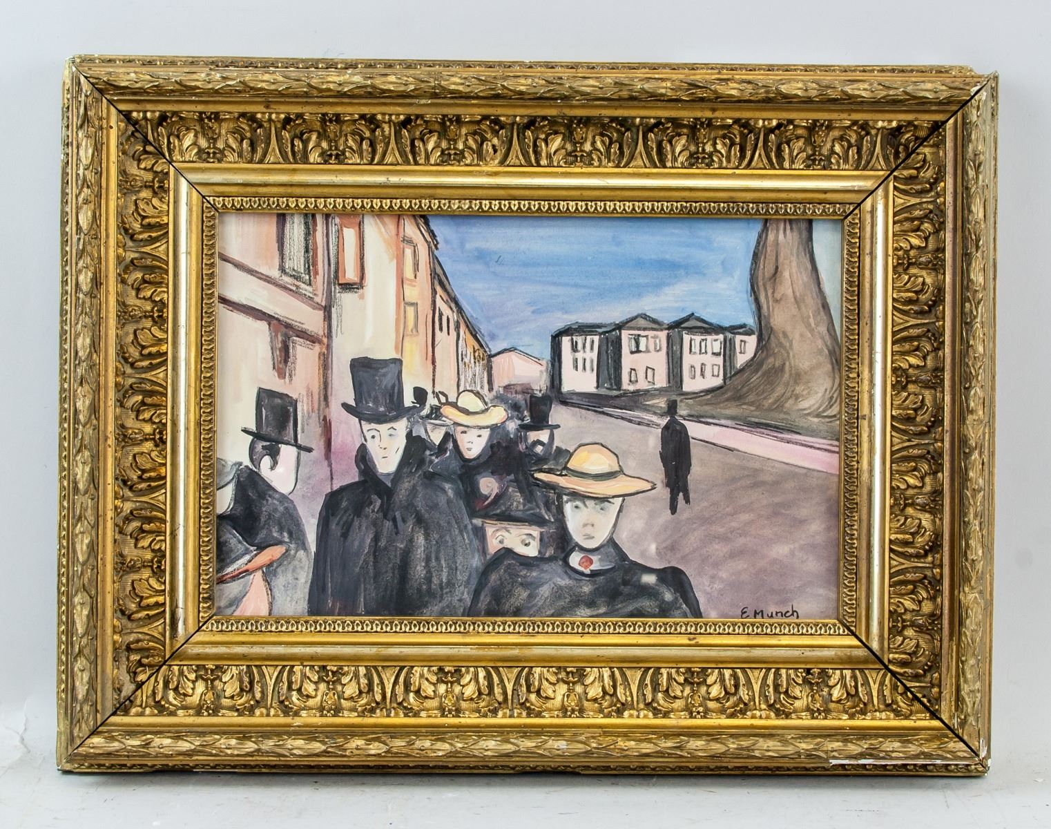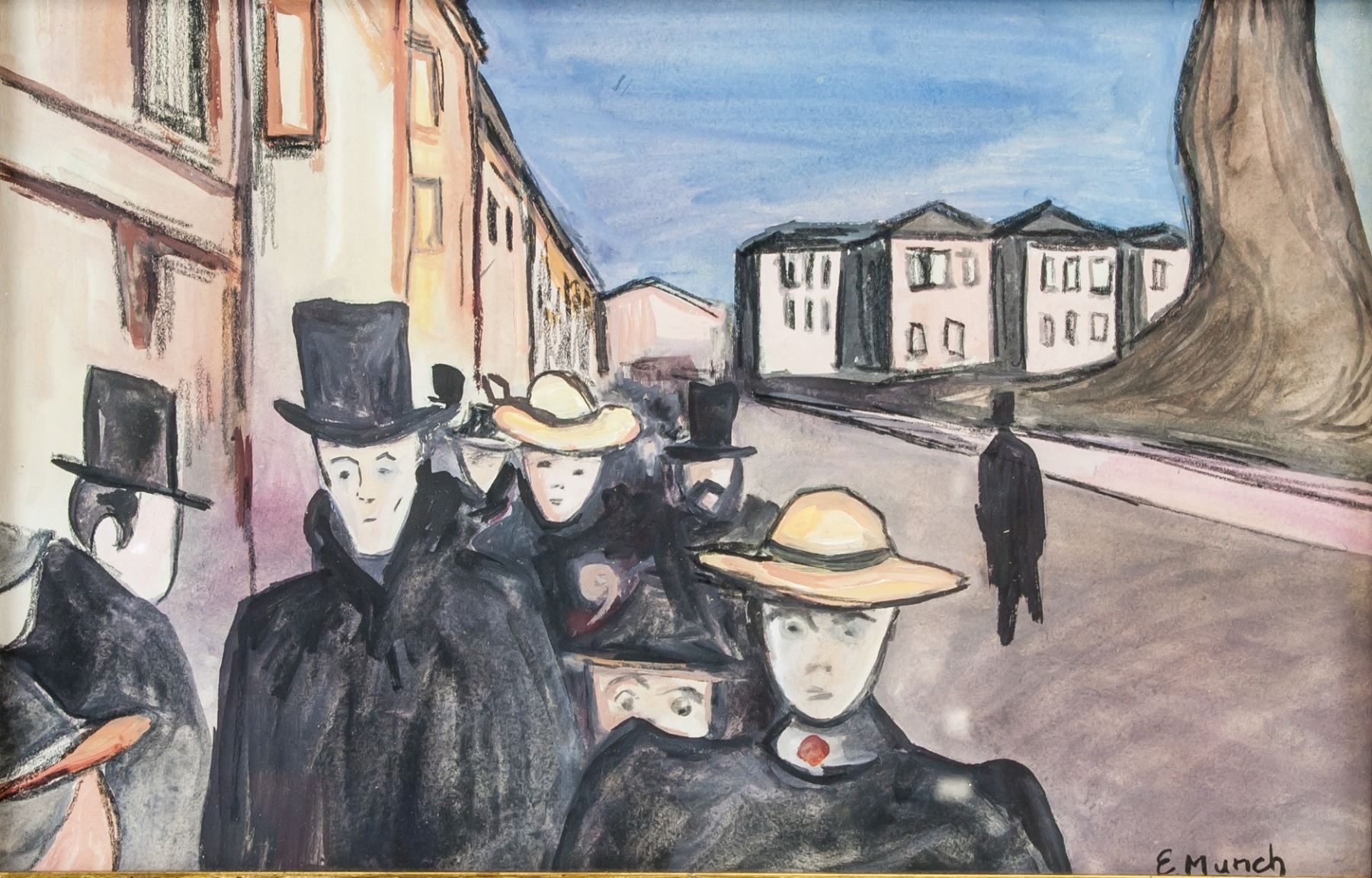 Tempera on paper, framed. Featuring walking figures. Signed and attr. Edvard Munch (Norwegian, 1863-1944) on the lower right corner. 18 x 27 cm (31.5 x 41.5 cm). A recognized forerunner of Expressionism, Norwegian painter and printmaker Edvard Munch is renowned for his representations of emotion. Associated with the international development of Symbolism, Munch experimented with many different themes, palettes, and styles of drawing. Though stylistically influenced by Paul Gauguin and the Nabis, Munch’s subjects are drawn from his Scandinavian roots and his own tortured psyche. His most famous painting, The Scream (1893), illustrates a tormented cry translated into waves of color that resonate across the landscape. Though based on Munch’s own experience, The Scream has become an instantly recognizable symbol of anxiety and alienation. Often reworking his paintings into etchings and lithographs, Munch was also one of the major graphic artists of the 20th century - he took an experimental approach to printmaking and contributed to the revival of the woodcut. PROVENANCE: Southern Ontario estate