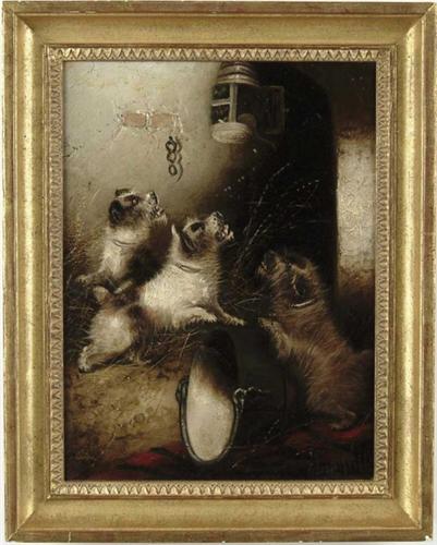EDWARD ARMFIELD (British, 1817-1896) “THE HEIGHT OF IMPUDENCE”. Oil on canvas scene shows three dogs looking up at an open unlit wall lantern which houses a mouse. The dogs rest their front paws on an upside-down shallow milk bucket. Signed lower right “E. Armfield”.. Housed in a modern gilt molded wood frame. Pencil titled and signed on back stretcher also. SIZE: 16” x 12”. CONDITION: Very good. 9-26751