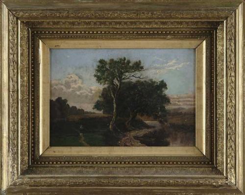 EDWARD C. COATES (American, 1816-1871) GOING FISHING. Oil on canvas landscape scene shows a boy with long fishing pole walking down path to river with rowboat tied to tree. Two large trees are seen on high bank with fields on either side. Signed lower left "E. Coates". Housed in a fine period gesso decorated frame. SIZE: 9" x 13". CONDITION: Three canvas patches to reverse with corresponding inpainting. 9-27721