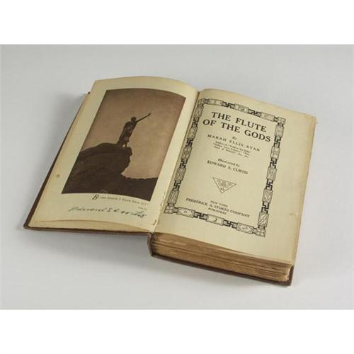 ANTIQUARIAN BOOK: First edition Marah Ellis Ryan's ''Flute of the Gods'', note Edward Curtis photographs as illustrations; this copy has ink autograph of Edward Curtis opposite title page. New York: Frederick A. Stokes Company, 1909. Wear to binding, five illustrations (pages 18, 108, 118, 128, and 178) removed, foxing and browning of pages, staining at inner boards, tissue separated at title page, bookstore label at front cover, bookseller notation in pencil and name in ink at first pages.