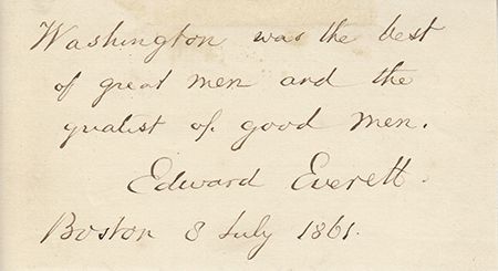 (1794 - 1865) American clergyman and statesman, a brilliant orator who spoke prior to Lincoln at Gettysburg. A.Q.S. on slip of paper: "Washington was the best of great men and the greatest of good men. Edward Everett. Boston 8 July, 1861. With 6" x 9" engraving of Everett.