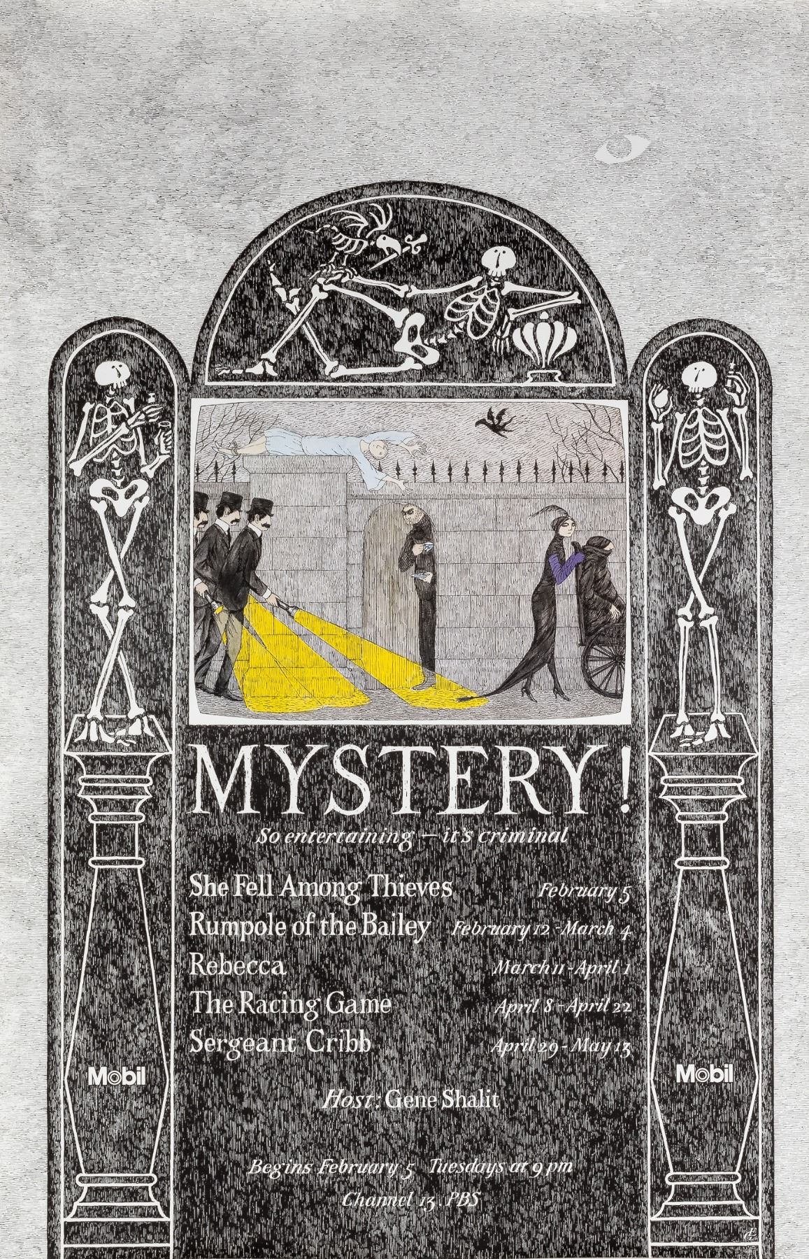 Mobil promotional poster advertising the British show 'Mystery!' for Channel 13, PBS, artwork by Edward Gorey (1925-2000), 1979, 46 x 30 inches.
