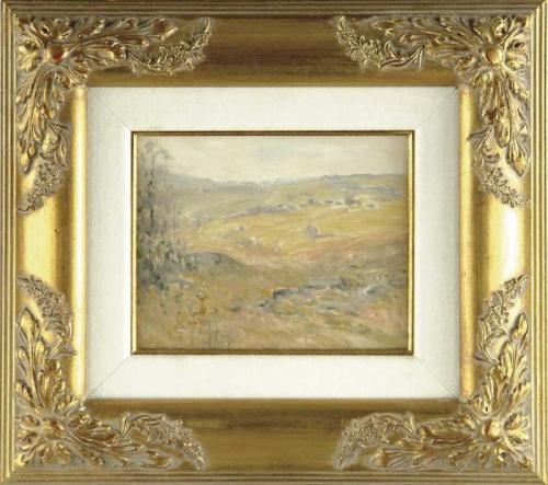 EDWARD LOYAL FIELD (American, NY, 1856-1914) PASTURELAND UPSTATE NEW YORK. Hilly fall pasture scene with rolling hills. Probably Catskills or Hudson River Valley--probably 1880's to 1890's. Oil on heavy paper. Signed E. L. Field lower right. Framed in reproduction antique-style gilt gesso frame. Ex the estate of E. L. Field, (Tovar collection number 20). Field studied in France under Carolus-Duran. After returning to the U.S., he became a full member of New York's prestigious Salmagundi Club. SIZE: 8" h x 10" w. CONDITION: Very good to excellent. 9-27983