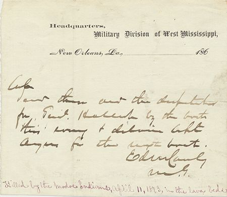 (1817 - 1873) Union major general who commanded the Department of New Mexico stopping Sibley's assault on California. He later commanded the assault on Mobile and after the war was killed by Modoc Indians. Scarce war-date A.D.S. as major general on Military Division of West Mississippi letterhead, 1p. 12mo., New Orleans [n.d., ca. late 1864], to an unnamed colonel: "...Send these and the dispatches for Genl. Halleck by the boats this evening & deliver Capt. Augur's for the next boat. Edw. Canby, M. G.". Period red ink note at bottom margin, else near fine.