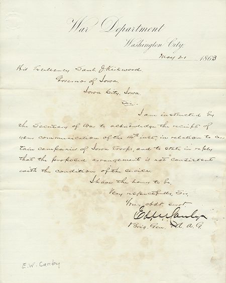 (1817 - 1873) Union major general who commanded the Department of New Mexico stopping Sibley's assault on California. He later commanded the assault on Mobile and after the war was killed by Modoc Indians. Fine war-date L.S. as Brig. Gen. and A. A. G. of the War Department, 1p. 4to., Washington, May 21, 1863 to the Governor of Iowa. In part: "…in relation to certain companies of Iowa troops…the proposed arrangement is not consistent with the condition of the service…". Minor toning, else very good.