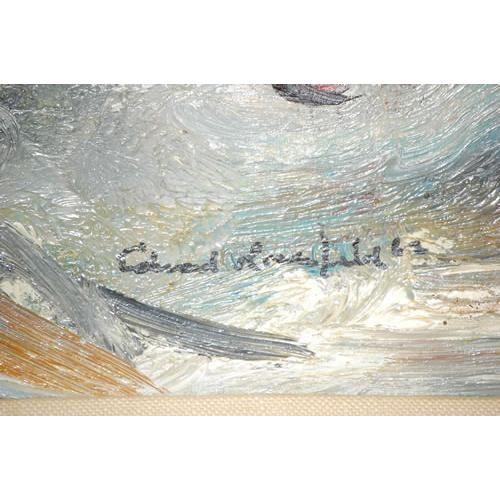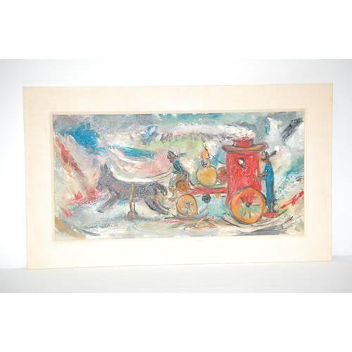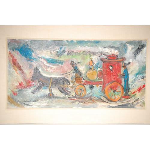 EDWARD ROSENFELD FIRE ENGINE PAINTING-OIL ON ARTIST BOARD OF HORSE DRAWN STEAM ENGINE ON SNOW, TITLED ON BACK W/ AGRA GALLERY LABEL TOY TRAIN ON THE SNOW, SIGNED ON LOWER RIGHT (11 1/2" X 23 1/2") - GOOD CONDITION