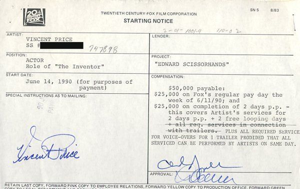 This is an absolutely incredible archive containing the Signed Contract and other paperwork from Horror master Vincent Price's last feature film playing the role of "The Inventor" in the Tim Burton classic "Edward Scissorhands" starring Johnny Depp.