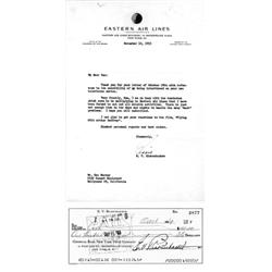 EDWARD V. RICKENBACKER: (1890 - 1973) American aviator and World War I ace credited with 26 "kills", later president of Eastern Air Lines. Pair of signed items, includes a signed personal check "E. V. Rickenbacker", New York, Oct. 16, 1969 making a $150.00 payment to "Cash", ink cancel clear of signature, sold with a T.L.S. "Eddie" on Eastern Air Lines letterhead, 1p. 4to., New York, Nov. 10, 1953 to a friend declining an invitation, noting: "...I am so busy with the headaches which seem to be multiplying in Eastern...There is just not enough time in the days and nights to handle the many 'must' problems..." Two pieces, very good. $100-150