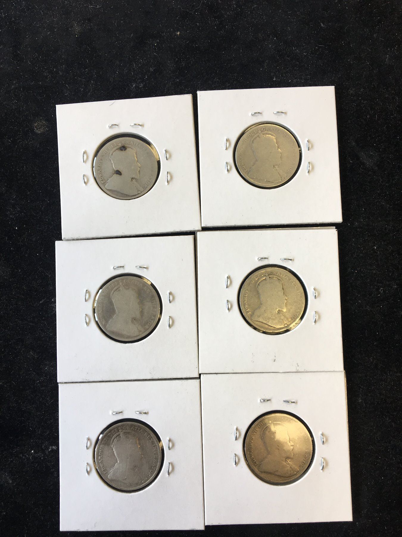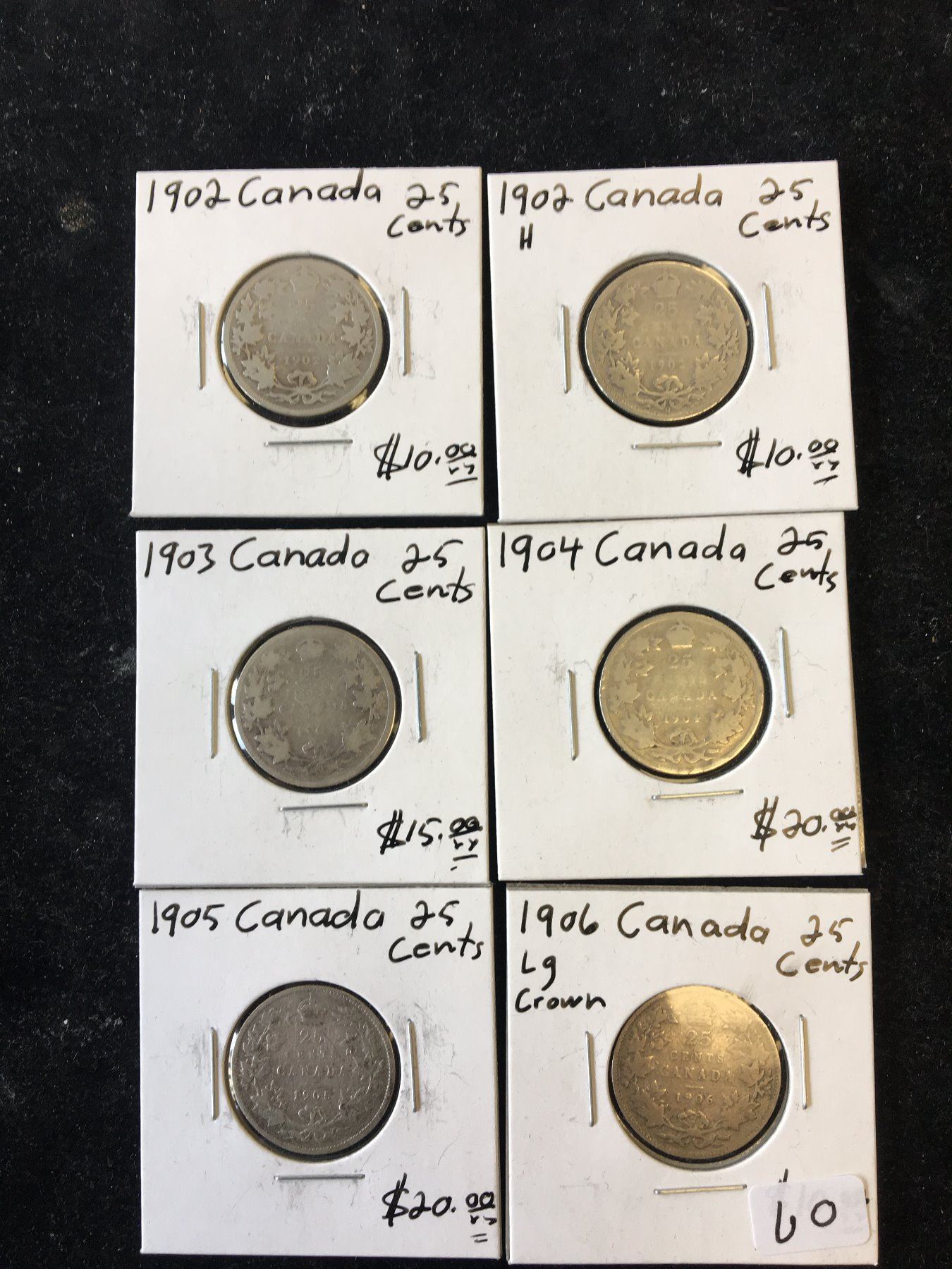 NICE LOT OF 6 CANADA 25 CENTS! 1902,02H,03,04,05,06..GRADES ARE G-4