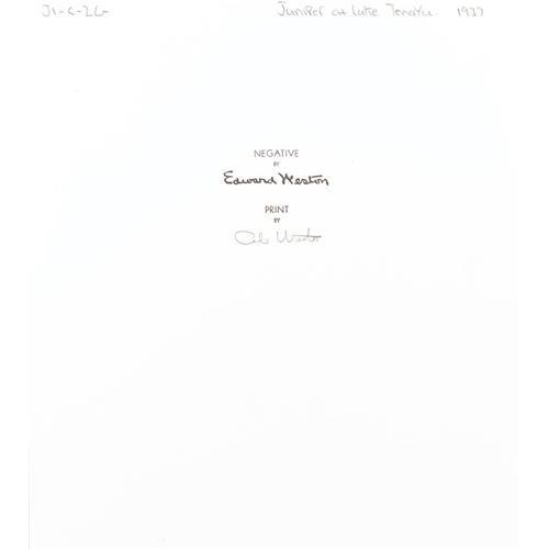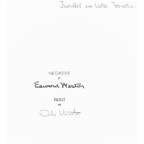 <B>EDWARD WESTON</B></I> (American 1886-1958)<BR><I>Juniper at Lake Tenayu,</B></I> 1937<BR>Gelatin silver print, mntd<BR>9-1/2 x 7-1/2 inches (24.1 x 19.1 cm)<BR>Original negative by Edward Weston<BR>Printed by Cole Weston<BR><BR>Provenance:<BR>The Collection of Mrs. Rowena Nadig (San Antonio, Texas)<BR><BR> <B>Condition Report:</B> Original condition<BR><BR><b>Shipping:</b> Requires 3rd Party Shipping (<a target="_blank" href="http://www.heritageauctions.com/common/shipping.php">view shipping information</a>)