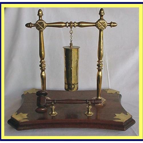 Corners of base are fitted with brass crowns that give the base a nice finished look. The brass stand for the gavel echoes the slightly curved sides of the base and the acorn finials with the engine turned edges. Elegant brass posts with acorn finials both on tops and at ends of the cross bar. The part that is hit is a wonderful shiny brass cylinder with concentric rings on top. <P>