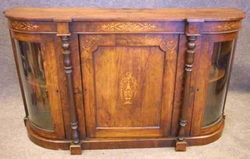 EDWARDIAN BURL WALNUT CURVED GLASS PARLOR CABINET with inlay decoration
