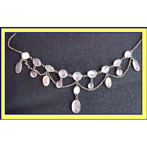 Edwardian Arts and Crafts moonstone and silver festoon necklace. Early 20th century.<BR>Measures just under 15 inches from end to end.<BR>Silver chain with round and oval moonstones in 3 tiers, the chains like swags or garlands with 2nd and 3rd tier moonstones suspended from them . Shows the neck and chest beautifully when worn. Hook clasp.<BR>No marks found (no place to put them) but guaranteed sterling silver.
