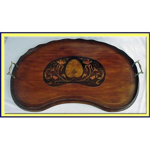 Kidney shaped tray with brass handles on either end. Main wood is believed to be mahogany and the inlays are a variety of coloured fruit woods. A string of cream-coloured wood is inlaid about 1 inch from the rail/guard. Inlay consists of scrolling botanical subjects showing strong Art Nouveau and Aesthetic movement influence.