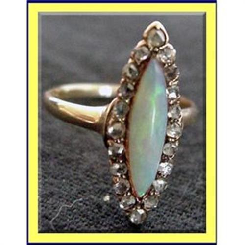 Antique Opal and mine cut diamonds set in gold ring. We think this is Edwardian , but it could date to the Art Nouveau or Deco period.