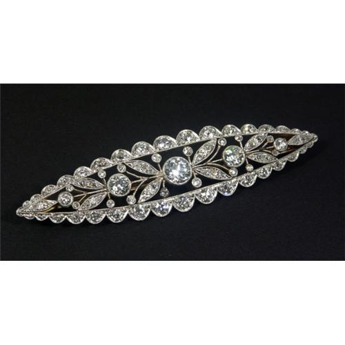 BROOCH: Dazzling Edwardian platinum, 18K gold and 14K gold oblong brooch set with old European cut diamonds. The center diamond is bezel set measures approximately 1.16 ctw, with VS2 clarity and I color. Two side diamonds measure approximately 1.02 ctw the remaining sixty-four diamonds measure approximately 2.03 ctw. All the diamonds but the center stone have VS2 to SI2 clarity with H to J color. Appraisal included.